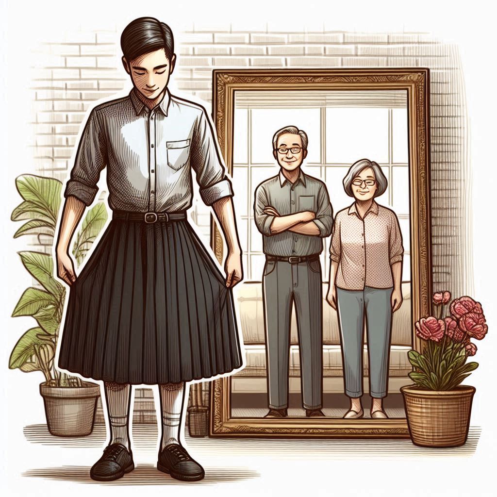 AI-generated image of a man wearing a black a-line skirt in front of his parents