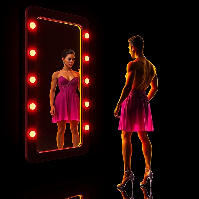 AI-generated image of a man looking at a female version of himself in the mirror